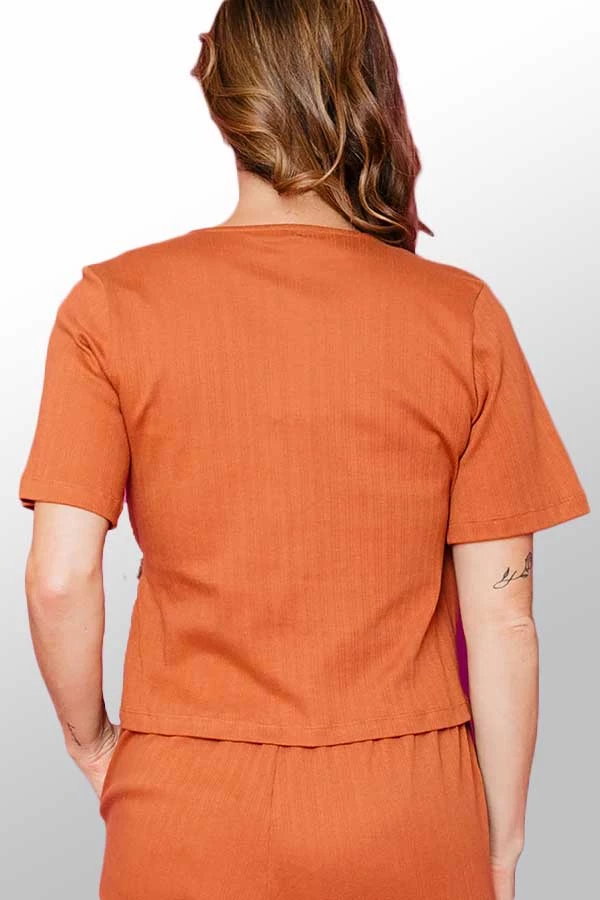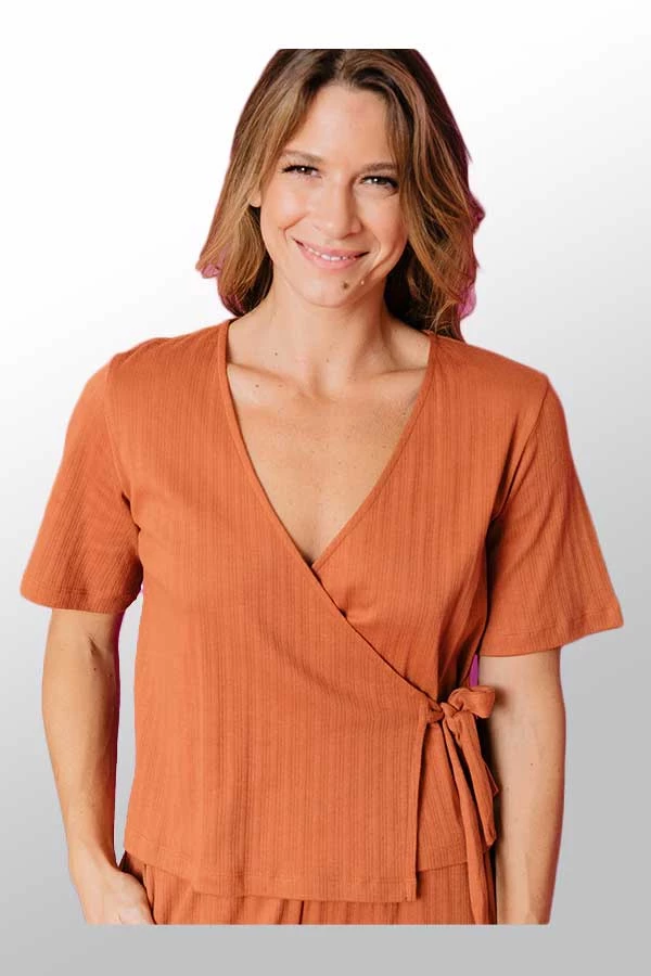 A  versatile top with a faux wrap front and an adjustable side tie. This top features a v-neck neckline, and it is cut from a super-soft rib knit. Pair with your favorite pants or skirt and you’re good to go!