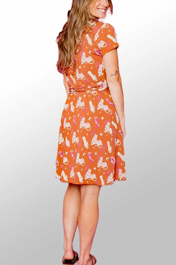 An organic cotton wrap dress features a swingy skirt adjusted with a tie. Very soft organic cotton jersey gives comfort to the body and tiger print gives an edge. Fun and casual with an excelent message – “Do not under-estimate me!”