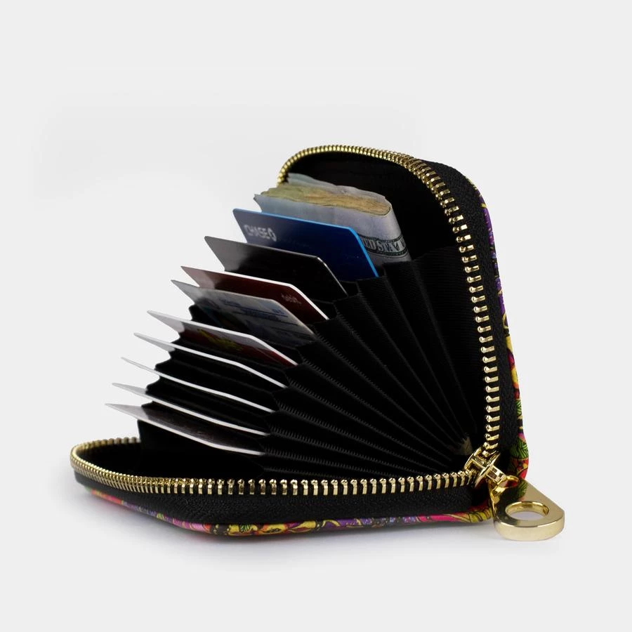Features full grain leather texture with a fabric 11 pocket divider interior, exposed metal zipper and boasts RFID protection to protect you from identity theft. RFID blocking technology prevents unauthorized access to personal information, credit cards, debit cards, banking information, driver’s licenses, etc.