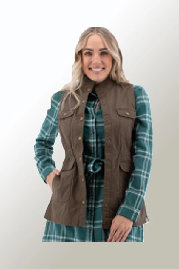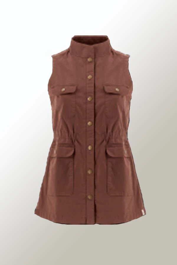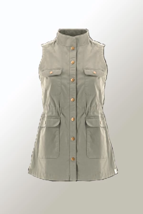 A practical and good-looking vest to add a bit of warmth on your walks. Plenty of pockets – four altogether, easy snaps closure. The vest is lined with fill-in between the layers. The waist has one each elastic adding a nice shape and interior is quilted. Long enough to keep the draft away, Medium size measures 27″ from shoulder down. Good addition to your wardrobe.Â