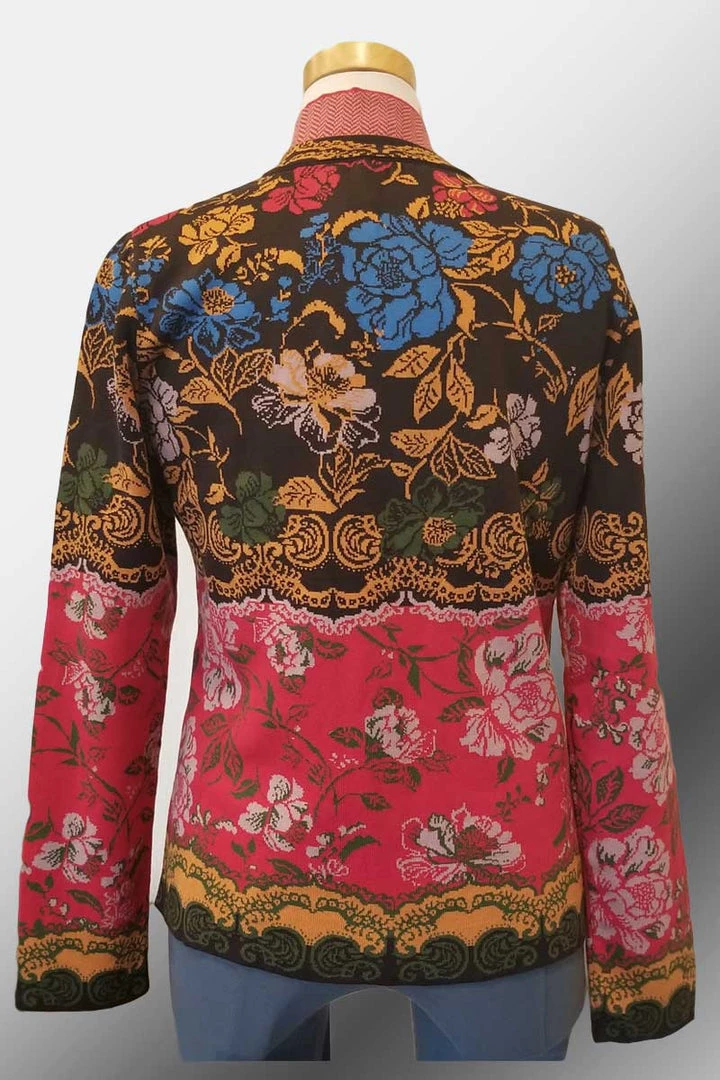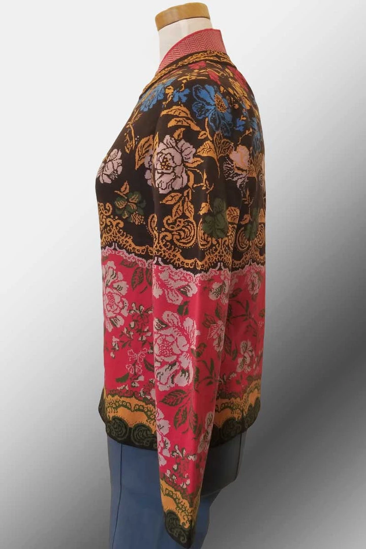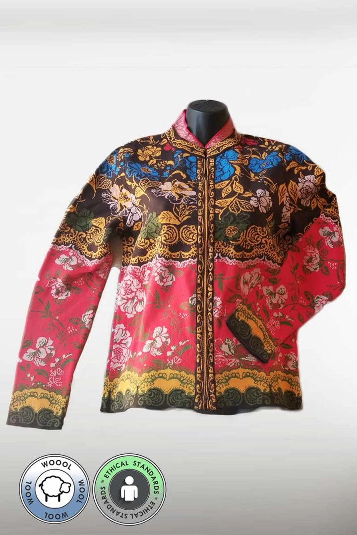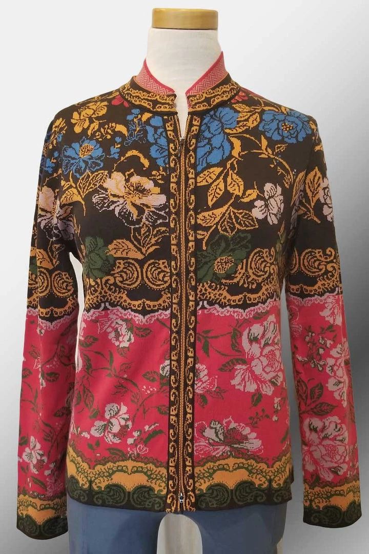 Vibrant and colorful this organic cotton zipped jacket is full of life and passion. Reds, browns, and gold weaved intricately in a beautiful pattern. Fully zipped front, sweet 1″ neck trim, long sleeves. This sweater is gorgeous for the woman that is not afraid of color and pattern and love of life. The quality is superb, the design and artwork is unparalleled – rooted in hundreds of years of tradition but relevant and fashion forward.