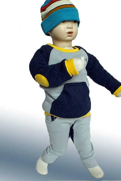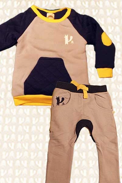 Sweet, fun, and super nice – organic cotton pants with as a Fox in the woods. Comfy and warm, thick organic weave in colorful blocks of soft light grey and navy with yellow tie at the waist.Â
