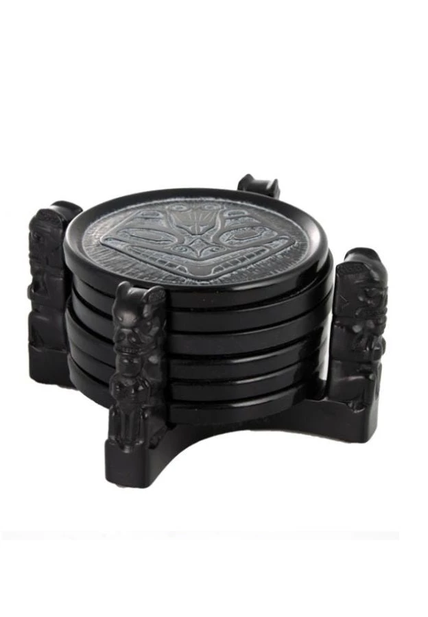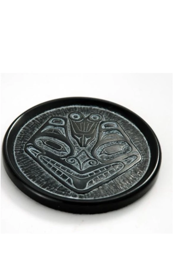 Beautiful Coasters with a design of a Bear Mask. Sold in a set of 4 or 6 -with the stand. Made in Canada. 3″ diameter.
