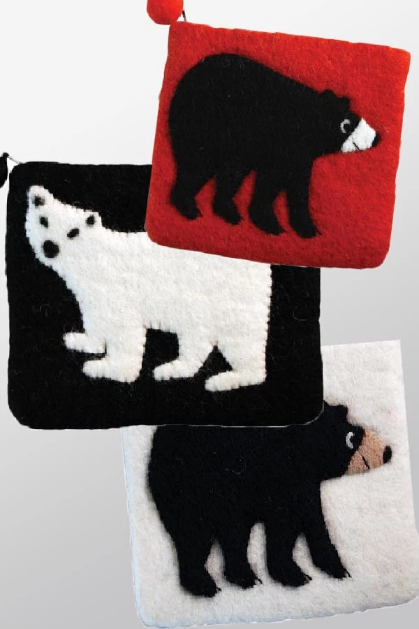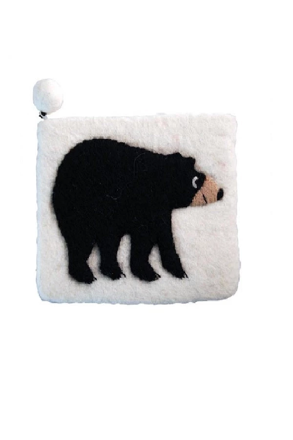 Felted Zip Pouch with Black Bear design White. 5″ x 6″