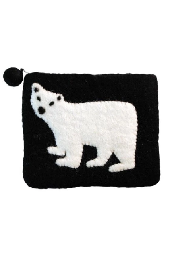 Felted Zip Pouch with Polar Bear design Black. 5″ x 6″