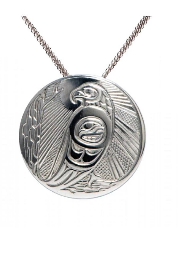 This beautiful and elegant pendant by Bill Helin is made of a special silver and pewter alloy and is presented on a sterling silver chain. This piece has been 100% designed and made in Canada. 1″ diameter pendant with 18″ chain.