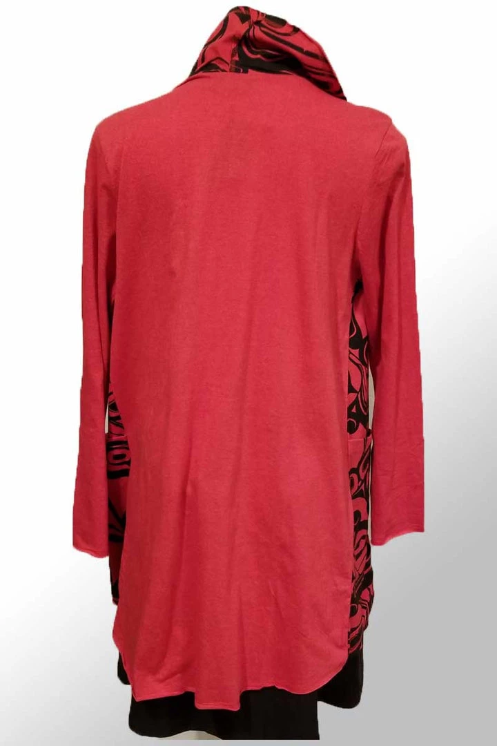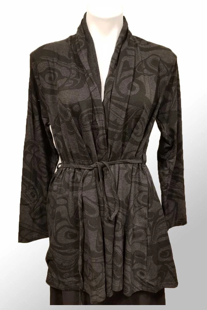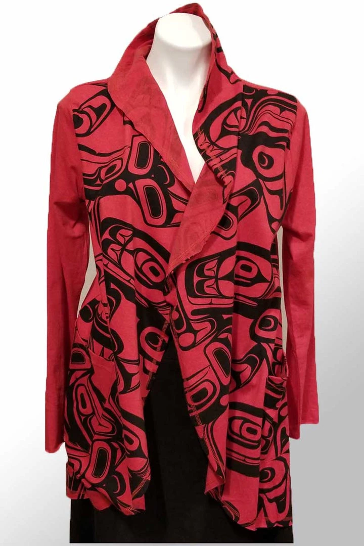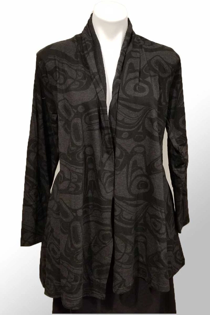 Fabulous coat with an A-line cut, flattering and easy without the front closure, long sleeves. Beautiful whale artwork was designed by Native American artist, Kelly Robinson of the Nuxalk and Nuu-chah-nulth nations. Read about Kelly’s achievements below. The artist receives part of the proceeds from each sale.