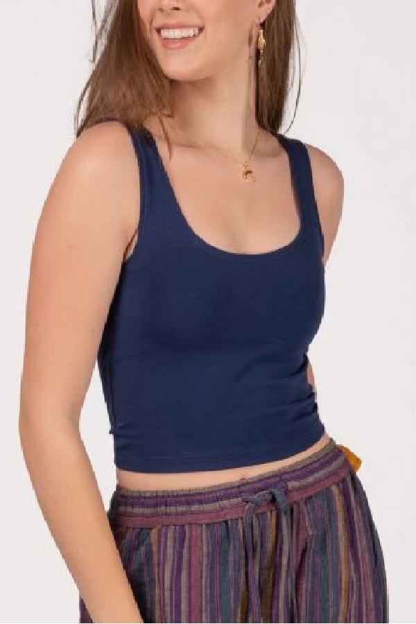 Nice, lightweight organic cotton blend cami that is great worn by itself or as a base layer. Close to the body with a nice scoop neckline and short length, very pretty rich color. Designed for a tight fit, for a looser fit, size up. Tag printed on the garment.Â