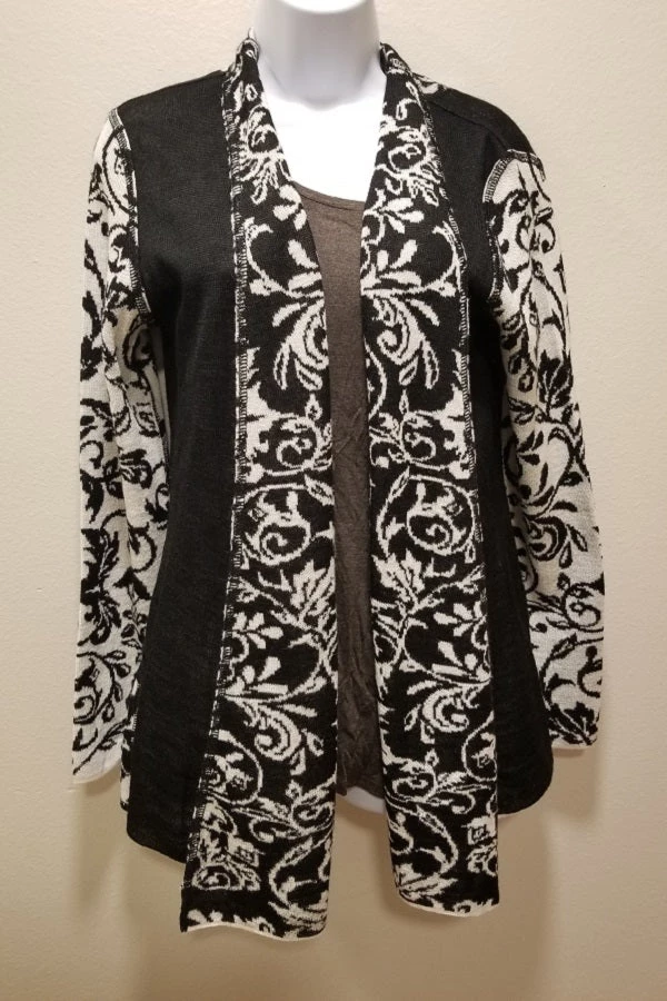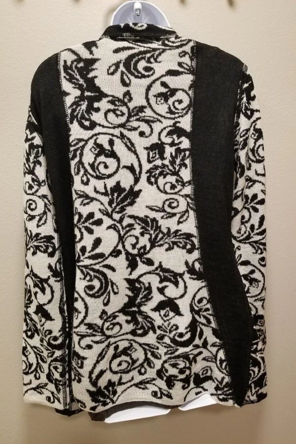 One of the most popular styles, this cardigan wins with black slimming insets on sides that flatters any figure. White and black portions have beautiful intarsia patterns. Slight A-line shape of the jacket. Open front is very slightly longer in front which helps make the sweater look even when worn. Sweater is not lined. Beautiful.