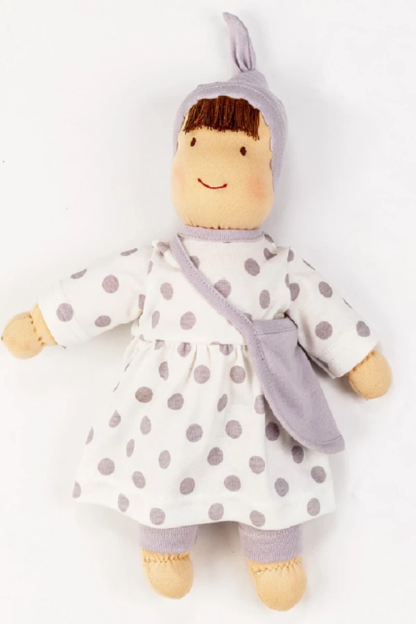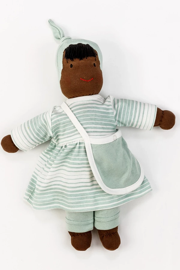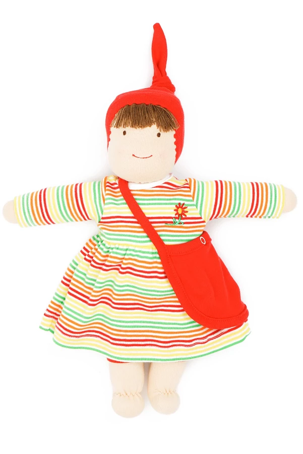 These dolls are dress-up dolls, made and stuffed with organic Egyptian cotton. Built to inspire imagination and play. She comes with an extra change of clothes in her bag – helps to teach coordination skills. These dolls are handmade and suitable for all ages, each is approx. 16″ tall.ย 100% Certified Organic Egyptian Cotton.