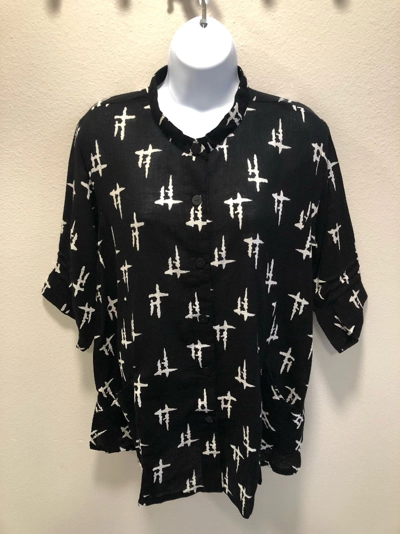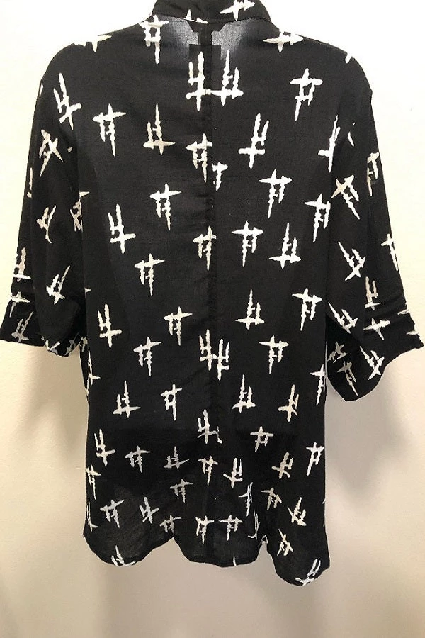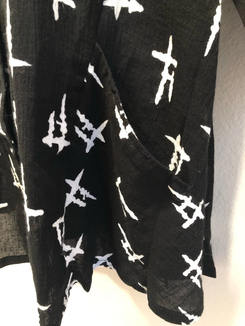 Beautiful light cotton blouse with delicate printing. Scoop neckline slightly rounded bottom hem. It has 3/4 dropped sleeve and small placket on the back. Bottom has two 6″ slits and two sweet pockets in front. Designed in Japanese tradition of understated esthetic focused on the beauty of print and fibers. The colors/patterns may vary slightly with each garment, all unique and all beautiful.